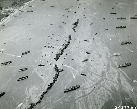 Overhead view of American Liberty ships acting as makeshift breakwaters off the Normandy invasion beaches, June 1944. Dozens of ships, dubbed “corncobs” for the purposes of this operation, were intentionally sunk roughly 1,000 yards offshore to create “Gooseberry” breakwaters for the Mulberry artificial harbours at Omaha and Gold beaches.